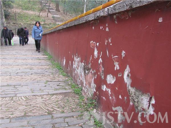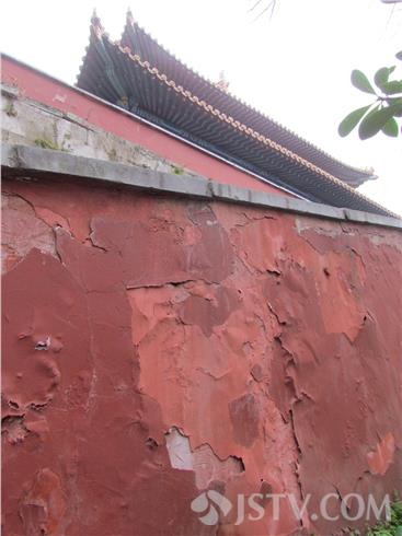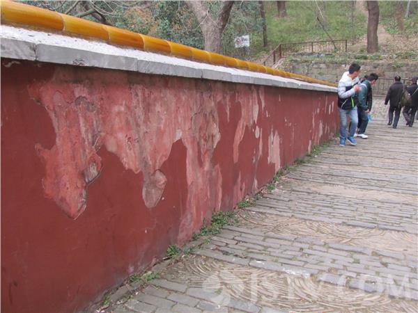 笔者去明孝陵游玩的过程中,发现明孝陵明高大的红墙,由于风吹日晒,红色墙面出现褪色、掉皮、脱落,形成大花脸,很是煞风景。在“文武方门”东西两侧红墙油漆已经褪色、多处墙皮脱落。再往里走,到达“方城明楼”,在通往方城明楼通道上,两侧大面积脱落,墙皮已经变得毛毛躁躁,随时都有掉下来的可能。外地游客说:“明孝陵是世界文化遗产,每天慕名而来的游客众多,看到如此脱落、掉皮该好好修修了。”