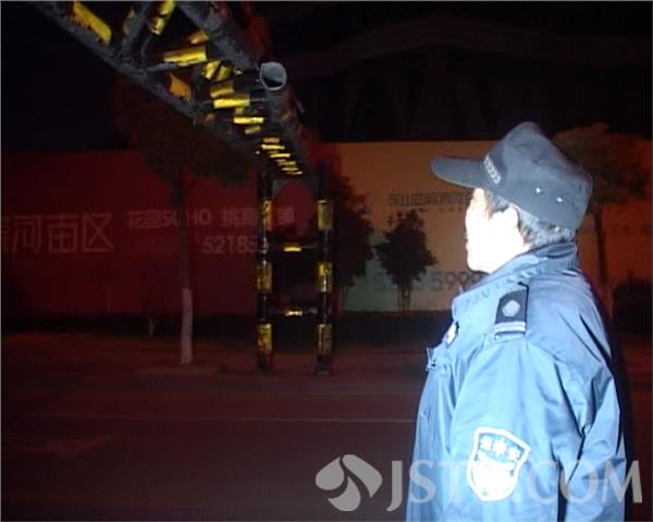 附近保安王师傅发现后,老王赶紧在现场当起了“临时交警“,指挥行人靠边行走,同时让车辆慢速通过。王师傅告诉记者,由于他在上班,当时没带手机无法报警,记者赶到及时拨打了110,由于这条路车速较快,王师傅身边一时找不到警示标示,临时搬来小区垃圾桶放在路边坐警示标示,王师傅是边上班边指挥过往车辆,一站就是近两个小时,直到记者赶到拨打了110.半个小时后,市政部门的工作人员赶到现场,对受损的限高栏进行了拆除,以防给过往的车辆和行人造成伤害,同时,交管部门表示,对肇事逃逸的车辆将根据路口的监控进行追查,市民对这种行为也表示了谴责。