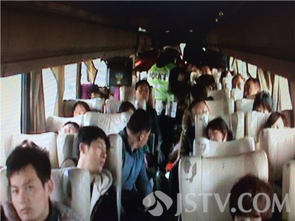 当天中午,交警在南京三桥收费站拦下了这辆皖C32805的双层大客车,交警随即上车检查。车辆线路牌上写着:“省际包车,从怀远到慈溪”,客车上下两层的座位几乎已全部坐满。