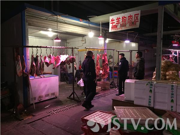 南京市六合区沪江商贸城内的这家曹奎牛羊肉经营部,为什么要往肉上抹红色液体,抹液体的是什么肉,抹的液体到底是什么物质呢?三月十五日凌晨三点五十左右,记者的摄像机镜头再次记录下了这样的画面:曹奎牛羊肉批发经营部开门营业不久,工作人员就将大量化好冻的牛肉拿出来,放到桌子上,涂抹盆内装着的红色液体。与此同时,店老板还到旁边的冷库内取出几包塑料袋装着的肉,剪开包装,将这些肉也放到桌子上,涂抹液体,然后再用三轮车将这些肉运到市场综合区的零售摊位。十分钟之后,公安、工商执法人员对涂抹液体的现场进行查处。