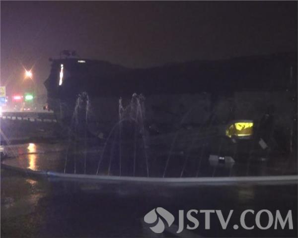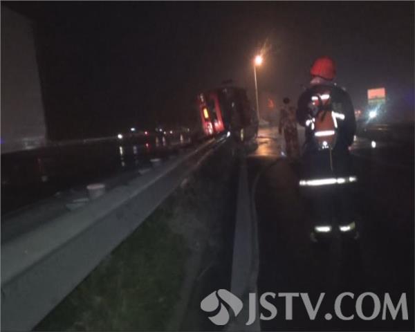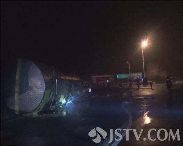 3月14日晚上9点50分左右,扬溧高速公路扬州市瓜州出口附近,一辆装载29吨醋酸危险品的槽罐车拐弯,因雨天路滑、车速过快,急打方向导致车辆侧翻泄漏,情况紧急,当地交警、消防、路政等部门接警后迅速赶往现场处置。