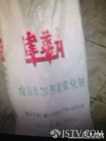 记者发现了一个蛇皮袋装的白色物质,上面写着食品添加剂氢氧化钠字样。