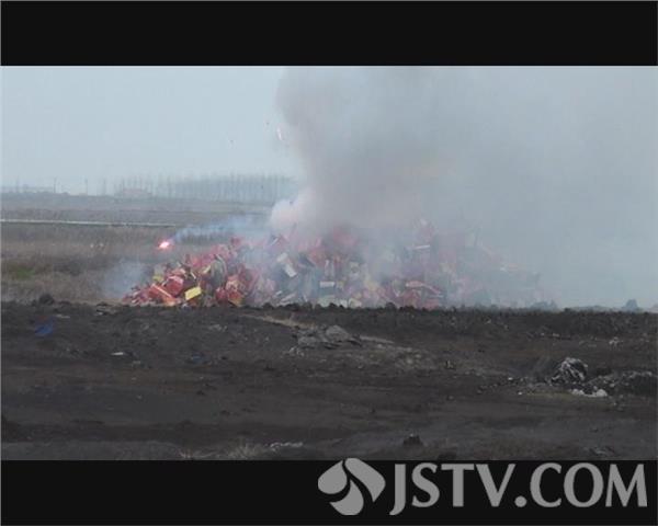 3月17日上午10点钟,射阳警方在海滨垃圾填埋场对去年以来收缴的3000余只(件)烟花爆竹和15万头鞭炮进行了集中销毁。