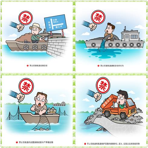 除传统媒体宣传外,张家港市还创新方式,选择《航道法》部分重要条款制作成生动形象的法治宣传漫画,定期通过微信、微博推送至市民群众手中,进一步加强与内河港航企业的联系互动,激发各类群体保护航道资源的积极性,达到执法与守法的双赢,为《航道法》的贯彻实施营造良好的社会氛围。(图为《航道法》法治宣传漫画)