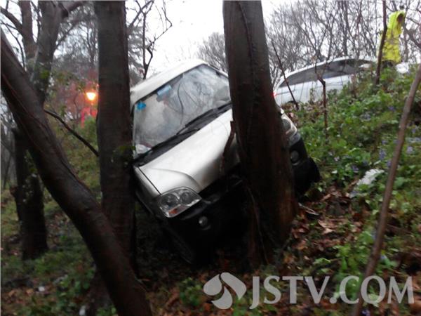 现场,发现一辆面包车车头左侧顶着一棵大树,右侧驾驶室倒车镜上方正好挤在大树上,中门还有一树小树挡着,车尾严重受损。经了解,他们是在南京做工的,驾车从太平门进入东郊龙脖子路时,因雨天道路湿滑,加上面包车方向发生偏移,车辆继续向前冲进南侧路基,据副驾驶室一男子介绍,见到冲下来时,吓得满头大汗,半天还不过神来。