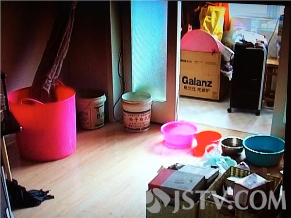 外面的雨虽然停了,但是这家住户的家里还是不断地在下雨,墙体还是源源不断往外渗水,这家住户程女士把所有能装水的容器都拿出来,大大小小在地上摆了二十几个,最大的这个桶,从昨晚到现在已经盛了第三桶。
