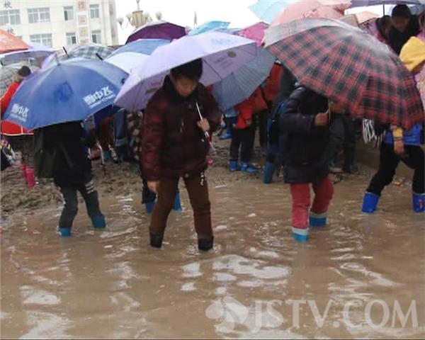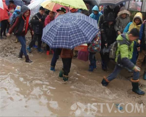 3月18日下午4点30,正是学生放学的时候,记者在学校门口看到,很多家长早早的来到学校门口接孩子。在学校的正门口,就有一个几十平米大的水坑,几乎没有一块干净的路面,小学生们不得不从泥水中趟行。
