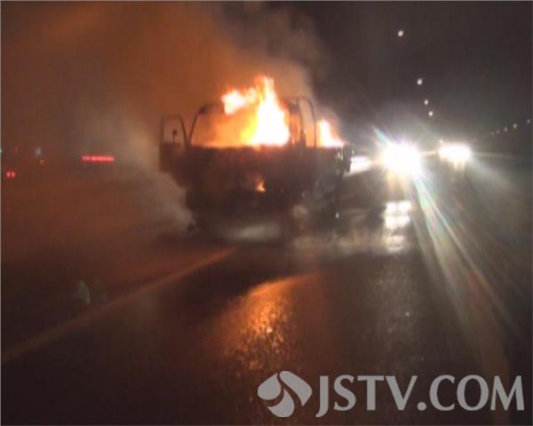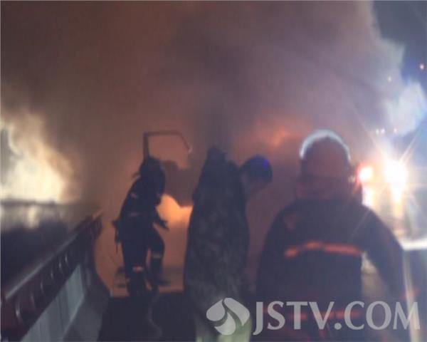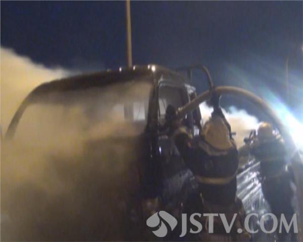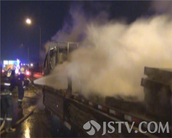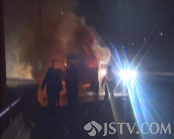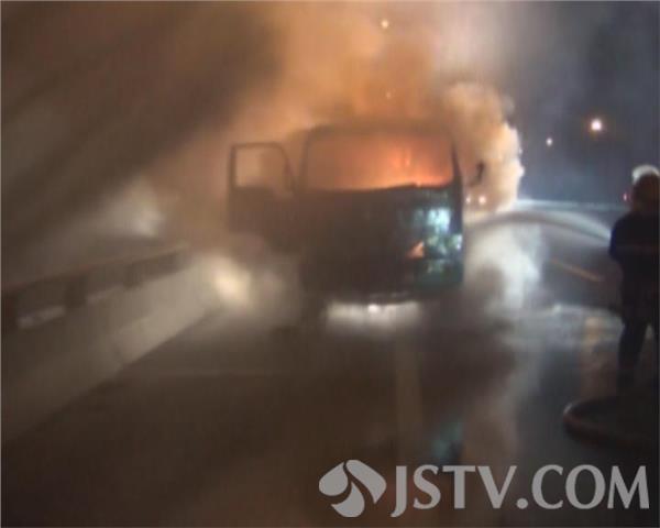 3月18日晚上8点多钟,一辆满载塑料制品的货车在行驶江阴大桥附近收费站时突发大火,司机果断将车辆停靠至应急车道,并拨打119电话报警。消防部门赶到现场后看到火势正呈现猛烈燃烧阶段,满车的货物已经付之一炬,熊熊火焰将大桥照的通红,更令人担心的是此时车辆还在发动,并无熄火。现场指消防官兵立刻出一支水枪打击火势,十多分钟后,大火被成功遏制。