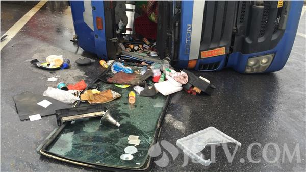 记者赶到现场时看到一辆辽宁牌照的大货车,是由南向北行驶的货车侧翻在路的左边,占了半个车道,很多的车辆行驶到这里只能减速慢行,驾驶室的挡凤玻璃己损坏,地上还散落一地的塑料碎片和玻璃碎片和驾驶员的生活用品,在驾驶室前面还有一堆象建筑模版似的,后面的货物全部翻倒,在一旁的保险公司也正在对事故车辆进行勘查,吊车也在对货物进行驳载,很多的货物木箱己经损坏,里面的物货全部散落,目前驾驶员已通知了货主。到记者发稿时,事故现场还在清理之中。