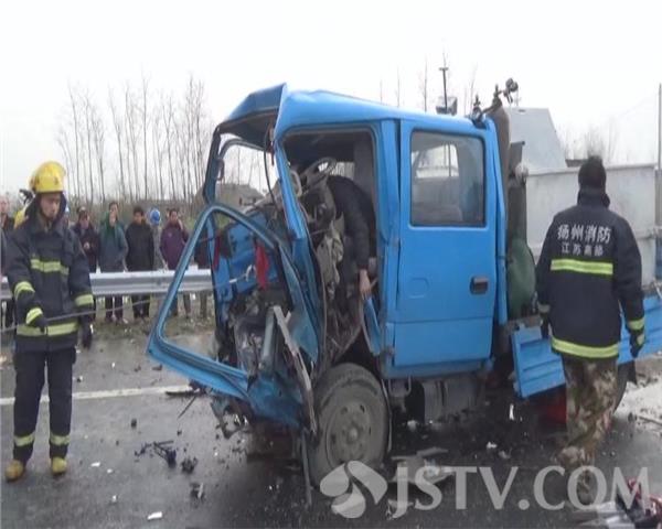 今天上午8点左右,扬州高邮市S237省道上,一辆运鱼的小型货车追尾撞上一辆半挂拖车,司机重伤被困,当地交警、消防、120等部门接警后迅速赶往现场救援。