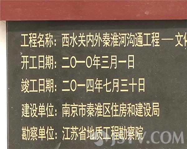 在大楼的底座,记者发现了一块大理石石碑,上面显示,这个工程名称是西水关内外秦淮河沟通工程,又名文化展示中心(赏心亭),该工程自2010年3月1日开工建设,2014年7月30日竣工,附近居民告诉记者,青奥会前,有关部门在楼的四周安装了景观灯,晚上灯光闪烁,非常漂亮。但不知道什么原因,大楼大门紧闭,一直不向市民开放。