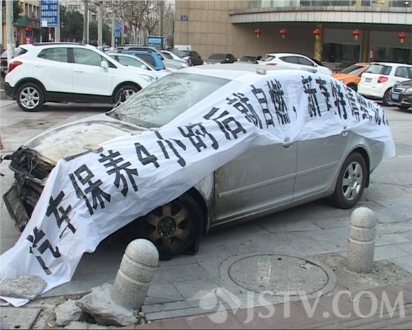 昨天下午,位于南京市江宁区天元东路的新奇特汽车维修保养店报警称,一名车主把一辆烧毁的轿车拖到他店门口,并且在上面挂了一条白底黑字的横幅,严重影响了他店的正常营业。。。而这名车主却坚称,他车之所以被烧毁,就是因为在该店保养了。他是为了维权,才这么做的。那么实际情况是什么样子的呢?