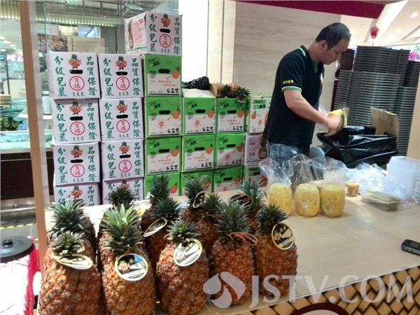 走进南通圆融广场一楼超市,一股“宝岛气息”迎面扑来:穿红色战袍的三太子雕像、说台湾腔国语的厨师、穿民族服装的工作人员、写有红色隶书繁体字的标牌、有着中国传统建筑歇山顶的花车,无一不让人感到新鲜有趣。在有着“金钻凤梨”之称的台湾屏东凤梨摊位前,围满了尝鲜的市民,只见摊主李先生拿着一只水果刀,刀起皮落,只几秒钟的功夫,一只又大又新鲜的凤梨就削好了,他告诉记者,他们家世代种凤梨,这些凤梨都是从他们家15亩凤梨田里直接空运过来,个大肉嫩多汁甜度高,因为一般的台湾凤梨都种12个月,而他们家种18个月,并且不用化肥。