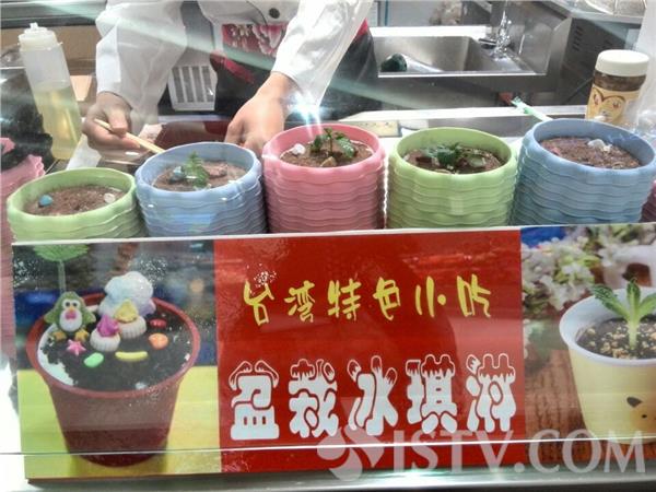 看过盆栽冰激凌吗?一只圆口杯子,再加上来自台湾的咖啡粉、巧克力豆、冰激凌、薄荷草等,在台湾师傅的巧手摆弄下,只一分钟,一只精美可口的冰激凌盆景就做好了,令人不忍下口。