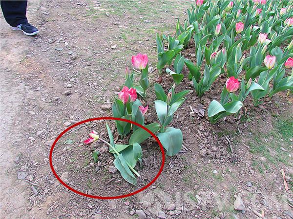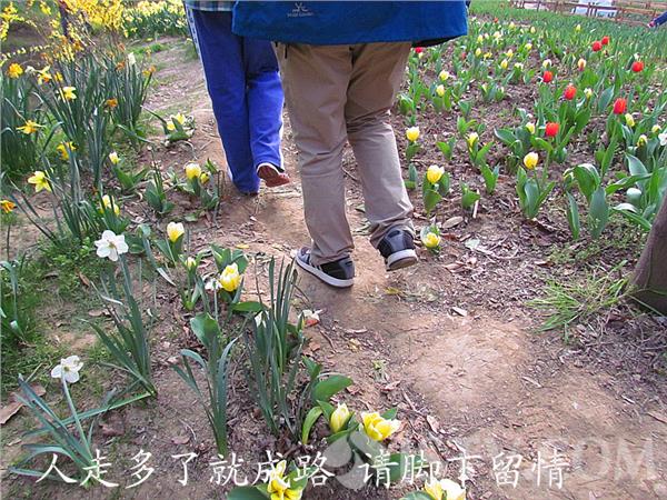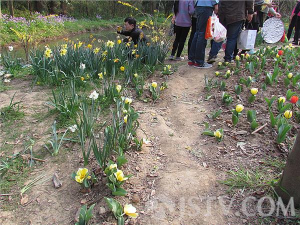 笔者在现场,刚到中山植物园公园南大门,透过围墙栏杆,发现大门西侧二月兰花丛中,一位美女登下身子对着同伴镜头摆出各种造型。进入园内,前来观赏“春之韵”2015欧洲花卉展市民络绎不绝。一路走来,各色花卉摇曳绽放,不少市民为拍出漂亮的照片想尽法子,借着花朵之间的空隙,走进花海,将一株株郁金香撞得“颤抖”不已,与郁金香、洋水仙、风信子等亲密接触,有的郁金香被踩断。不过在这一片美景中,有的被踩踏一条路。亲眼见到一位小朋友,竟然将路边一棵“菜”拔掉甩在路边。对此,摄影爱好者朱先生表示,市民在游园赏“春之韵”2015欧洲花卉展时候尽量在隔离带之外,不要践踏郁金香、洋水仙。