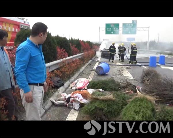 昨天下午1点左右,宁扬高速扬州段,一辆轿车与一辆小货车发生追尾,小轿车当场起火,而司 机和一名乘客都受了伤,被困在车内。见此情况,货车上的几名工人用铁锹敲碎车玻璃,将被困两人成功抬了出来。