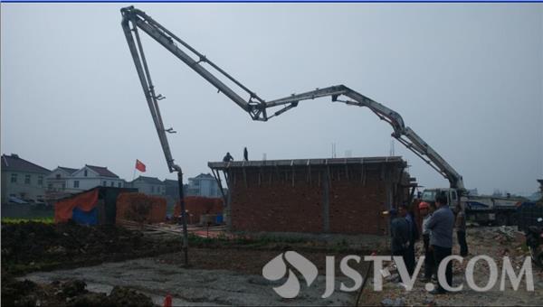 3月29日中午,长江中的小岛上,扬中市新坝镇五一村二组村民张明家新盖房子,正在铺筑房屋地基。记者在现场看到,一辆混凝土车辆,长长的管子,正在向地面流淌着水泥。几名工人把水泥铺平。