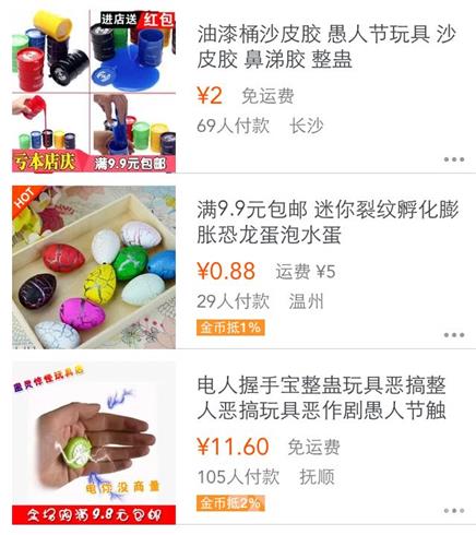 今天是愚人节,年轻人喜欢在这一天和家人朋友开个玩笑,快乐一把。不过,今年的愚人节与往年不太一样,人们的热情没有那么高了,一些以往热销的'整蛊玩具'也卖的不太好了。 在大学校园内记者随机采访发现,学生们都已经准备好了愚人节的娱乐项目。在他们看来,愚人节里和朋友开开玩笑,整蛊一下可以增进友谊,也是一种放松。 在一些购物网站上,各式各样的'愚人节玩具'多达一万多种,类似'电人打火机'、'喷水马桶''等整蛊小玩具,数不胜数。然而与往年不同的是,虽然价格都很便宜,但销量只能以'惨淡'来形容。很多市民表示,随着大众对'愚人节'的熟悉,整蛊玩具已经失去了新意。 相比起网店的遇冷,实体店更为消沉。记者走访一些礼品店发现,想要寻觅一些整蛊小玩具也并不容易,有的店里已经没有了整蛊玩具的踪影。