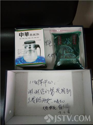 4月1日一大早,大丰市公安局指挥中心副主任练学娟同志刚下电梯,却发现五楼电梯口放置着一个纸盒,盒盖上写着“练主任收,大桥薛华”。练主任好奇地将盒子拿到办公室打开,却见里面有一盒茶叶,一只泡茶的水杯。水杯的包装盒上也写着同样的字样,盒底内侧写着“谢谢你们帮我找到了我的孙女”。
