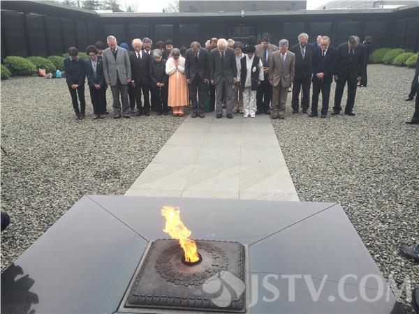 完成参观后,27名访华团成员怀着沉重的心情,缓步来到祭场,在熊熊燃烧的长明火前集体肃立,默哀。74岁的现任团长菊池健介是30年前首任植树访华团团长菊池善隆的儿子,他与本次访华团最年轻的成员、18岁的高中生横山贵大,一同敬献了写有'沉痛哀悼侵华日军大屠杀遇难者'挽联的花圈。