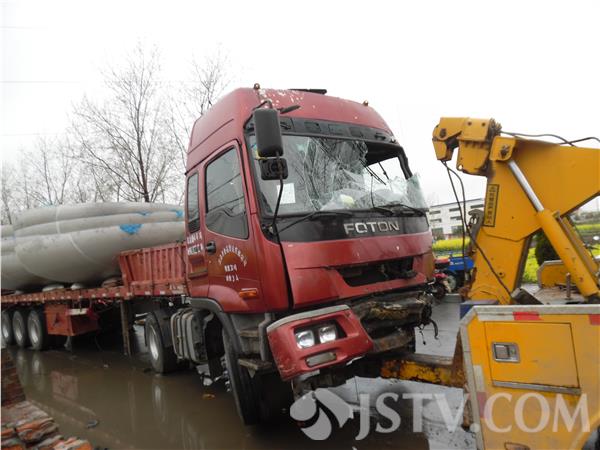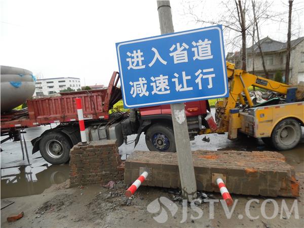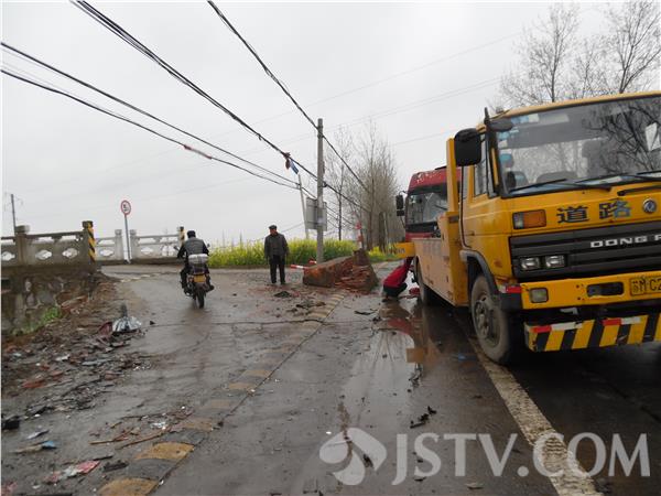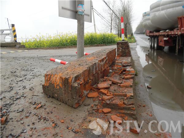 4月4日上午在兴化229省道荻垛镇路段发生一惊险车祸,一辆由南向北行驶的红色大卡车因为雨天路滑突然撞到公路东侧的防撞墙后,又将北侧的桥梁闻堰撞倒,车里的机油弥漫了整个河面,所幸驾驶员只是腿部骨折。