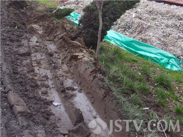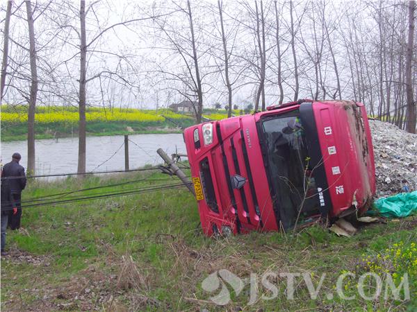 笔者4月6日中午接到爆料赶到位于刘光舍桥南侧的事故现场,只见一辆红色大卡车满载着塑料垃圾倾覆于公路东侧,公路边的几根水泥光缆被压在车下,近50米光缆被拉下垂。其中一根水泥光缆根部已经被压断,车上的轮胎深深陷在淤泥里,公路边留下一道长长的口子,路边多棵雪松被拦腰斩断,由于车上货物较重,驾驶员正在调集挖掘机将车上物品驳载,其他清障设备正在待命。