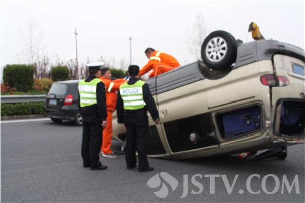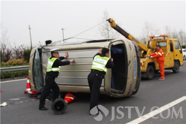 当日14时10分许,淮安市交警支队高速三大队值班民警接到报警后,立即指派治安秩序中队和路面巡逻中队民警迅速赶到事发现场开展救援工作。到达现场后民警发现一辆商务型面包车四轮朝天仰躺在高速路面上,整个车身占据了第二、第三车道,车顶及驾驶室已经变形,车内连驾驶员在内共3人,庆幸的是2名乘车人安然无恙,没有受到任何伤害,驾驶员没有生命危险,只是腿部严重受伤。随即民警立即联系了120及施救部门,并迅速将驾驶员送往医院进行救治。