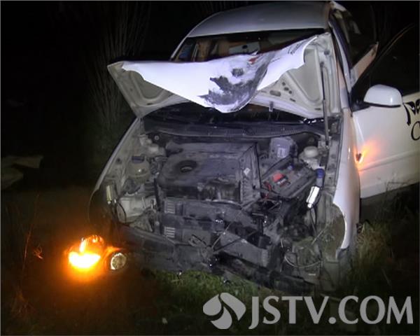 在不断的往下面水沟里滴油,在路下边靠路牌柱子旁边躺着后保险杠,在轿车后面的坡上还有一只灭火器,被撞伤的轿车驾驶员被120送到医院治疗。