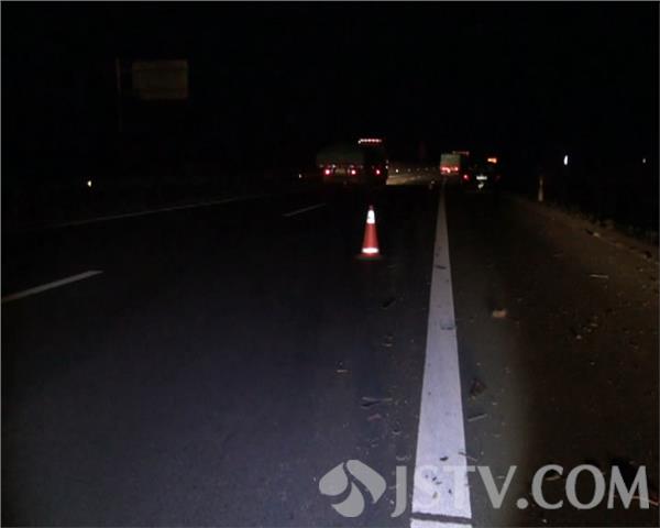记者赶到现场时看到由北向南的连云港牌照的大货车停在路边,大货车前保险杠被撞了凹了进去,左侧大灯被撞坏,地上撒落一地有50米长的塑料碎片,在大货车后面50米路西边沟里躺着