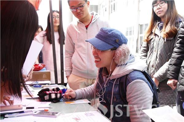 中午,在南京财经大学食堂门口,学校爱心协会举办了一个“当你老了”体验老人生活状态的爱心活动。大学生们戴上特制的模糊眼镜读文字,戴上耳塞,在手脚关节上还绑上沙袋。几分钟体验下来,不少学生大呼受不了,戴上特殊模糊镜片,阅读简单的几段文字很难,塞上耳机之后,对一些最简单的对话也听不清楚。