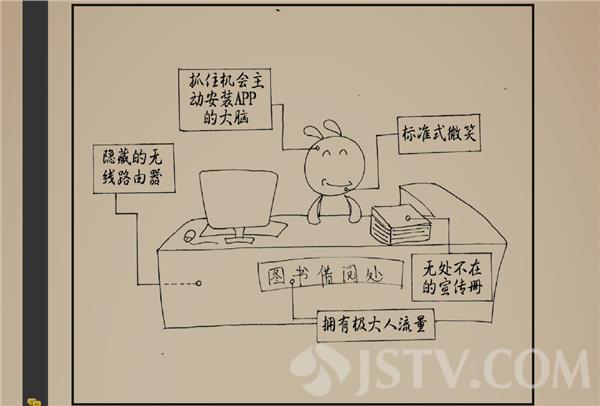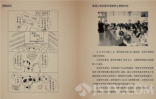 近日,一本《移动图书馆葵花宝典》风靡南理工校园,这本基于南理工移动图书馆使用案例总结而成的《移动图书馆葵花宝典》,封面为磁青底色,仿古书造型,书脊上印有“线装书”式样。封面下方有一人金鸡独立,手持南理工移动图书馆的二维码。这本宝典共分三路五重三十六个招式,每一式分为招式描述、动作要点、图解招式、移动图书馆使用之案例分析四个部分,其中每一篇图解招式都是手绘漫画,这种漫画式的解说使得内容一目了然。