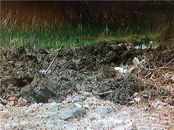 上午十点多,记者来到南京浦口区迎江路就看到,主干道上有多条车轮泥印。顺着车轮印走进这条岔路,记者很快找到了被偷倒渣土的池塘。