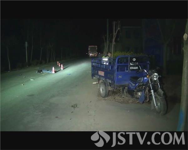 4月9日晚上7点钟左右,在射阳县海河镇彭庄村境内的四长线公路上,一辆由南向北行驶的三轮摩托车疑因对面货车的灯光闪眼,造成视线不清,将在路边散步的一对父子撞飞后,又与该辆货车发生碰撞,事故导致一名中年男子死亡,孩童受伤,车辆部分损坏。