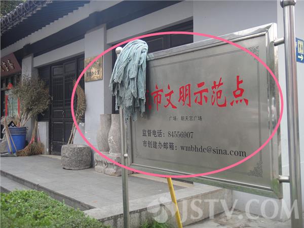 昨天,江苏网络电视台刊发了笔者采写的《朝天宫广场管理办公室门前如此脏乱差,令人汗颜》的曝料,反映朝天宫广场办公室门前脏乱差严重,与墙上悬挂着的金光闪闪的牌子极不相称。稿件发表后,秦淮区市政综合管理部门极为重视,昨天下午便指示广场办公室进行整改。今天早上7点钟,笔者再次来到这里时,面貌已经大有改观。原先矗立在大门两旁的扫帚已经移走,顶着在石狮头上脏兮兮地垫也已除去,门前污水横溢的垃圾车也不见了,。如今的广场管理办公室周围呈现出的是干净整洁的环境。