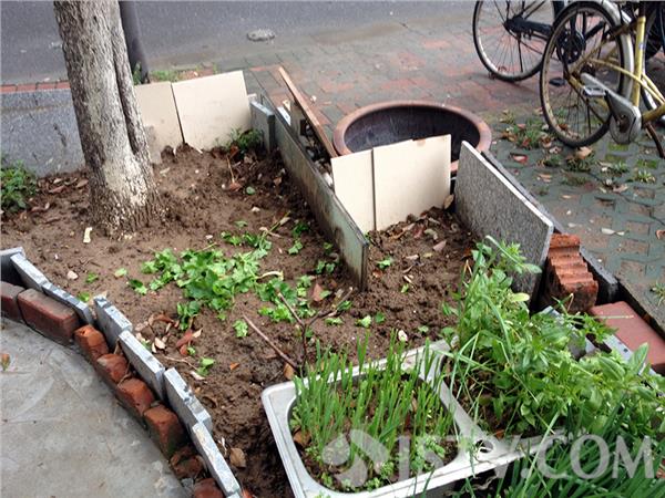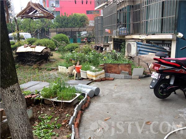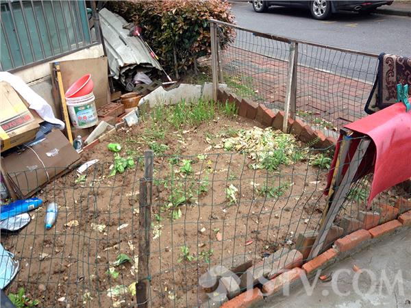 笔者在明发滨江二期现场看到,268一楼阳台被砸开一个口子,并按上防盗门,门前绿地上还铺上了混凝土路面,周围30多平方的小区绿化被铲除,围上铁丝栅栏,栅栏内种上了蚕豆、青菜和葱等蔬菜,更糟糕的是有的地方还有建筑垃圾围着,脏乱差触目惊心,“简直乱搞,买上百万的房子,来种一把的青菜不值2块钱,”小区居民议论纷纷。