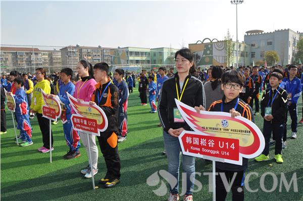 中国队员丁一元(音)代表350多名参赛球员宣誓,在接下来3天的时间里,这些小学初中的少年将和兄弟队在绿茵场上一一过招,角逐U10、U12、U14的冠军。对于即将到来的搏杀,孩子们表现得很淡定。13岁的甄嘉豪是南京外国语学校初一学生,目前“效力”于江苏国信帕尔马U14队,已经踢了7年足球,对于在家门口主场作战,他表现得很谦虚,他说,友谊第一,比赛第二,他和队友们会有精彩表现,争取取得优异的成绩。