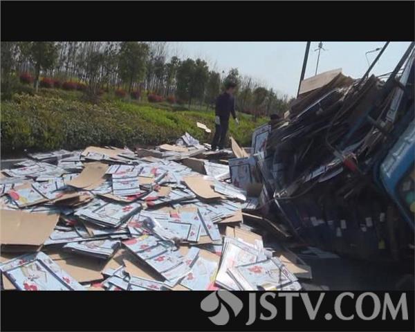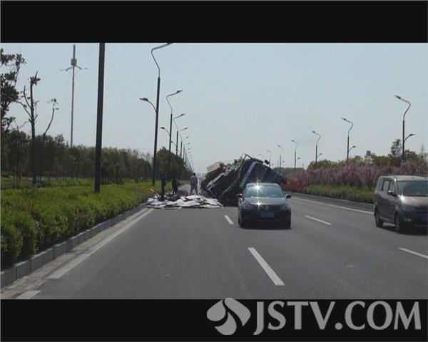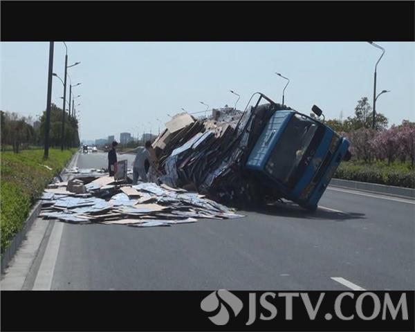 4月10日下午1点多钟,在盐城市亭湖区境内的亭湖大道上,一辆满载包装纸盒的货车在正常行驶过程中,疑因运载的货物堆放超高,发生倾斜,导致货车在路中央发生侧翻,所幸没有造成人员伤亡。