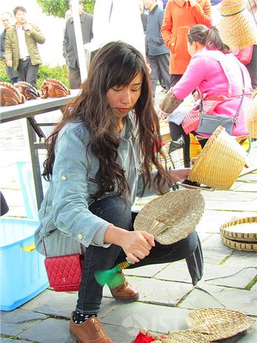 如今,在景区王尚顺编织的蒲扇、蒲鞋成了名副其实的“稀罕物”。“游客都喜欢,有时抢着买,一双蒲鞋买30块、蒲鞋15块把”。徐福庚 摄