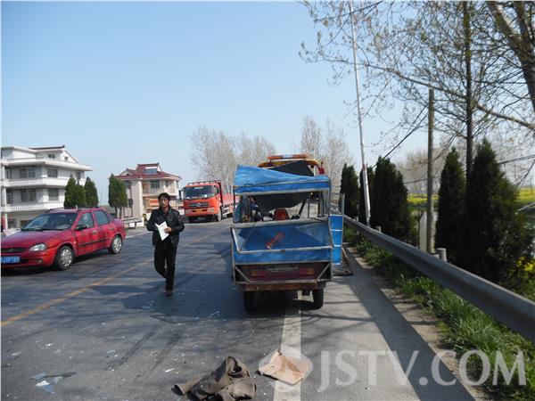 4月11日上午8时许,在泰州兴化229省道安丰武装河桥北侧,一辆由南向北正常行驶的三轮车突然遭遇一辆同向超车的绿色大卡车,三轮车被撞得支离破碎,车上二人受轻伤,目前事故原因正在调查处理之中。