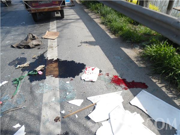 记者赶到现场时,清障人员正在将倒在地上的三轮车扶起,车身被撞得四分五裂,地上还残留有大量血迹,碎玻璃到处都是,据三轮车驾驶员介绍,他开着三轮车由南向北行驶突然超车的卡车将其车撞得个四脚朝天,车里两位老人随后被警车送往医院,在武装河桥北侧桥头我们看见一辆绿色大卡车,车上载满了树苗,据卡车驾驶员介绍,他沿着省道由南向北正常行驶,三轮车突然挤了上来,然后就撞上来了,目前具体事故原因交巡警正在进一步调查处理之中。