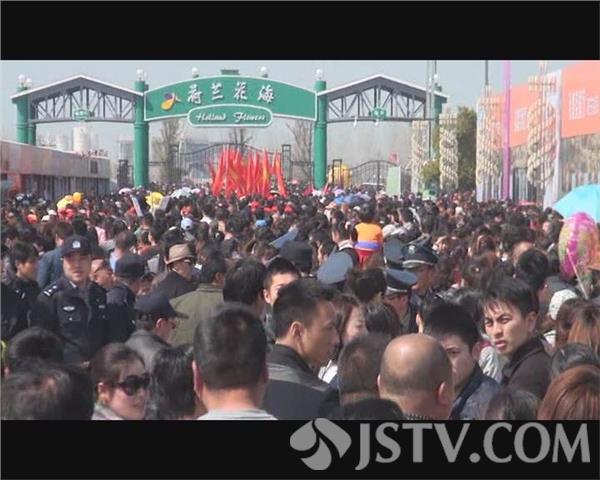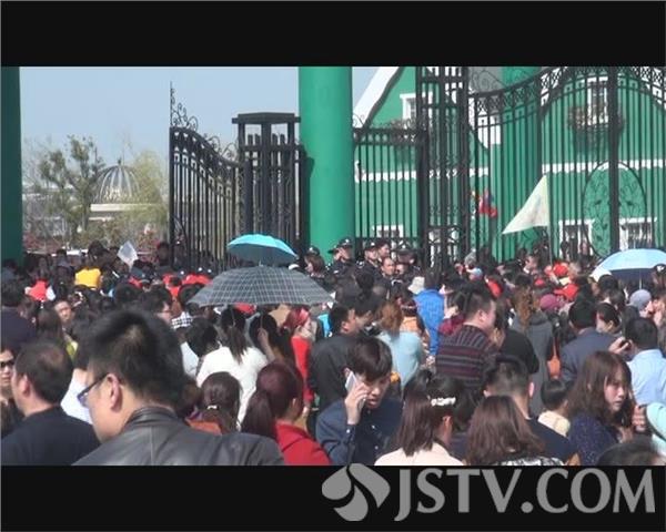 下午两点钟左右,记者驱车来到大丰荷兰花海景区,在距离景点还有几公里的地方,记者就不得不找地方停车,然后步行走到检票的大门口,而此时已经是人满为患,售票处暂停出售门票,检票工作人员也不得不暂停检票,只开一个小门供游客有序退场。由于无法进入到景区内部,不少游客就坐在大门边的草地上休息,等待放行。两点半钟左右,景区工作人员和值勤民警开始组成人墙,将蜂拥在检票口的游客分割开来,分批检票放行。