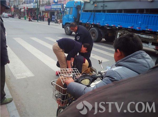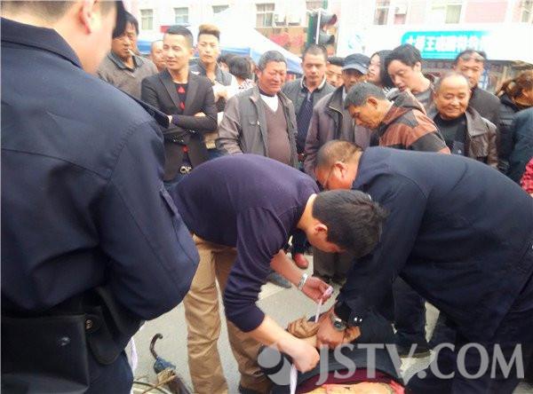 在笔者拨打报警电话后的第八分钟,一辆警车由北往南行驶而来并停下,从警车上下来两名民警。他们好像认识该男子,在警告该男子的同时,就将该男子放在自行车前的一把剪刀没收,由于该男子将斧头别在腰间,羊毛衫拉下遮住,很难看出。民警与该男子边唠嗑、边跑,一只手达在肩上,一只手在其身上搜索。突然,民警一下子摸到了该男子别在腰间的斧头,于是一只手牢牢握住斧头,肩上的手迅速下移到腰间,将其用双臂锁住,那男子边挣扎、边骂,挣扎的力道很大,笔者甚是担心那男子一下挣脱那锁住他的双臂,而拔斧伤人。在这千钧一发之际,围观人群中一道人影闪出,一招干净利落的擒拿招式,将那名欲行凶男子压倒在地,这时民警终于将那人腰间的斧头拔出,大家此时才松了一口气,都说好险。这时开车赶来的于警官找来布条将那名男子双手捆住,押上警车。此时大家才注意到刚才那上来帮忙的人,他的蓝色上衣上有一道为英文的标志:POLICE。围观人群不有自主的发出掌声,连声称赞,警察好样的!