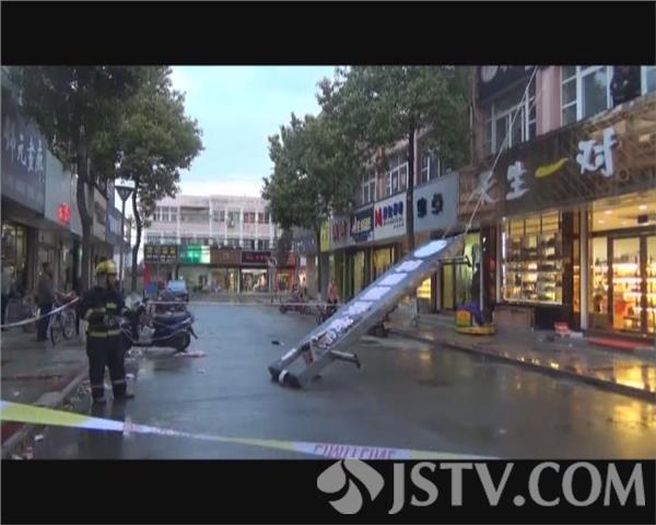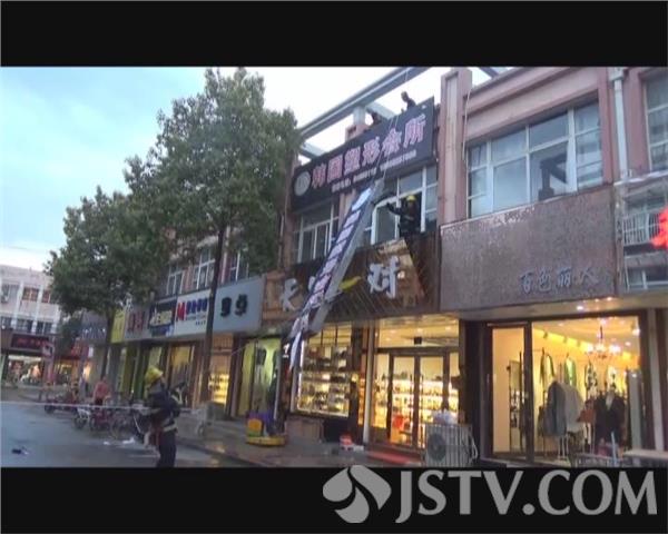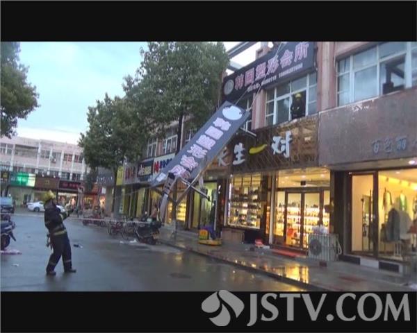 4月12日下午4点50分左右,扬州地区突遭强对流天气,雷雨大风,扬州高邮市龙翔商业城一商户广告牌被大风吹得摇摇欲坠,有掉落砸伤行人的危险,户主一边紧抓广告牌,一边报警求助,当地消防部门接警,迅速赶往现场处置。