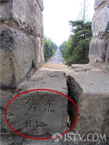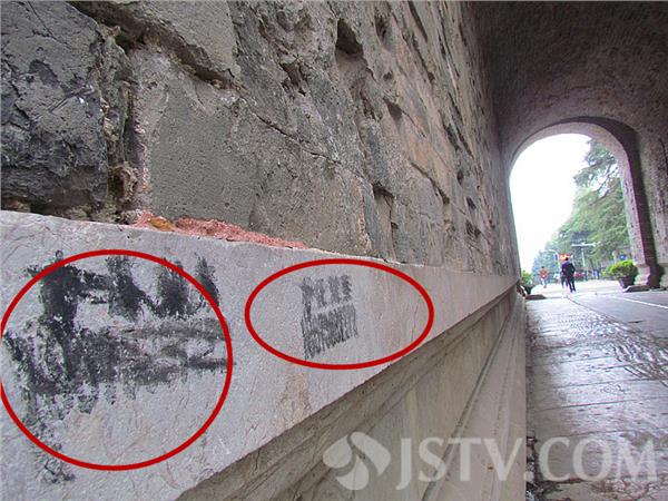 13日下午,笔者从中山东路午朝门公园北门,刚到门口,发现门口一对石狮,竟然有一只被人喷上“办证广告”电话18673817XXX;随后游览午门南北向中间的门洞,发现北侧高红大理石砌成须弥座,竟然“涂了两个办证电话”,是谁这么大的胆子竟敢在600多年文物石狮、午门上“涂上牛皮癣”;在午朝门门楼楼顶城墙砖上,也有游客在城砖上刻着很深的字迹“隽杰”名字,初略数了一下,乱刻乱画有不少,既影响观瞻。另外午门有一扇大铁门锈迹斑斑,一处折断,随时有可能倒下伤人,存在安全隐患。这些画面则与遗址公园的格调有些大相径庭。徐福庚 摄
