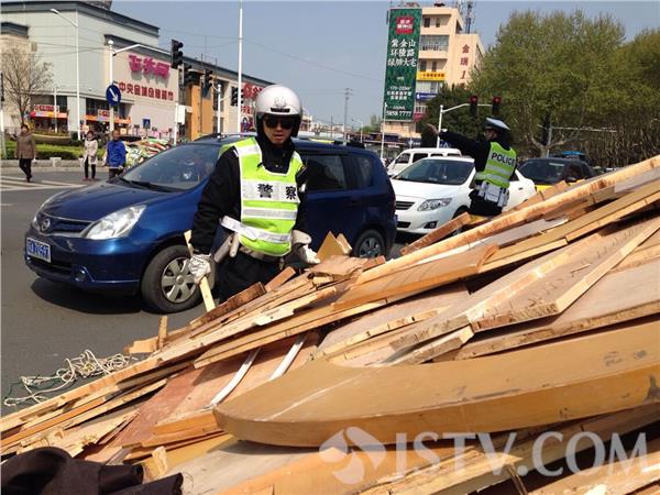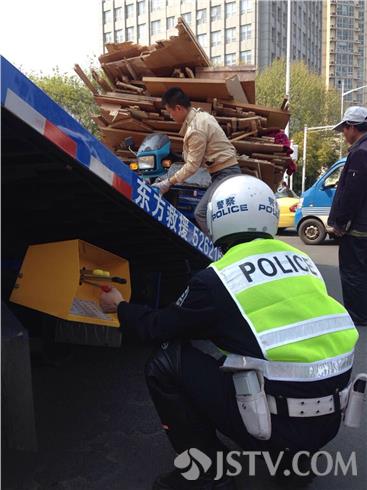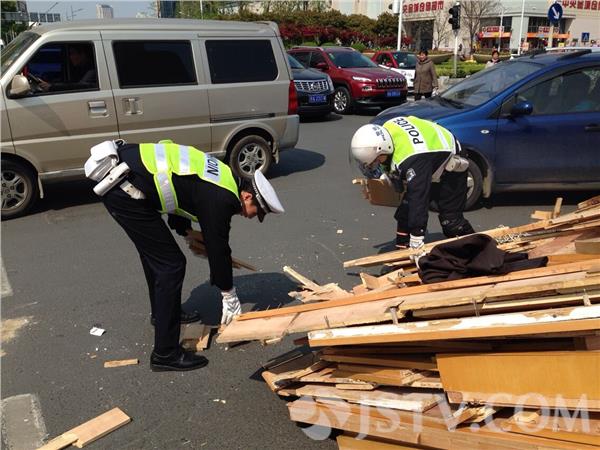 据南京交管局二大队程警官发来的消息,2015年4月14日下午2点左右,一辆无牌电动三轮车托载了大量木板,行驶至龙蟠中路常府街路口时,由于严重超载,导致爆胎,抛锚在道路中间,车上木板散落一地,正在附近执勤的二大队副中队长张堃和民警陈子骞迅速赶往现场,通知清障车前来拖车的同时,联合附近的市民一起帮助车主将大量散落在路口的木板搬离现场,恢复路口交通,同时,民警对该无牌电动三轮车进行暂扣处罚。