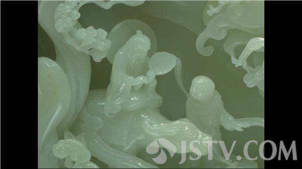 晶莹剔透的玉链是扬州玉雕的绝活,据介绍,两侧瓶耳处雕琢出的一对螭龙,彰显着精细刀工,而瓶身处则大面积留白,寓意着盛世太平。和《福寿如意双链挂瓶》一样,白玉山子雕作品《紫气东来》也体现了绝妙的'扬州工',其灵感取自于老子出关的典故,是吉祥的征兆。据了解,原石中部分材料色泽灰暗影响作品的品质,能工巧匠运用浮雕和镂空雕结合的传统技艺,不但规避了这处瑕疵,还让其更具立体感。