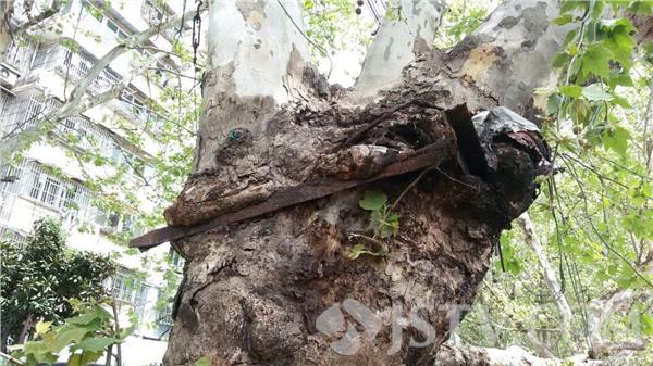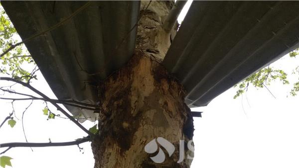 凑巧的是,就在刚才倒伏的大树旁,工作人员还发现了另一棵已经长得十分危险的大树,树干两侧已被两块硕大的铁皮瓦盖长进了树干。据了解,原来该树两边都住有人家,一些居民就顺势把树当成了支架,自从铁皮搭上树干后,多年来就一直未予取下,才出现铁皮“被”深深长进了树干的情况。初步观察,该树干直径约40公分的大树,两边铁皮瓦差不多就占据了90%,中间树干部分大约还只剩下不过5公分宽的样子,一旦遭遇大风,大树必将折断,形成和前面大树一样的后果,安全隐患不容小觑。