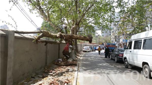 4月17日中午12:10分左右,南京城北姜家巷54号门前,有多位住户求助,称门前快车道上,一棵40公分的梧桐树折断了,横掛在3分之一马路的上空,十分危险,报警求助。民警随后赶至现场。