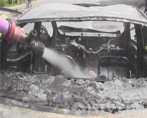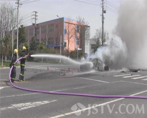 消防官兵到达事故现场后发现,事故现场有两辆车,一辆车撞停在了路边的小树林中,左边车门轻微变形。另外一车辆正停在马路中间,此时整辆车都被大火吞噬,且大火正处于猛烈燃烧状态。中队指挥员立即下令出一支水枪对火势进行打击,同时,交警部门负责疏散现场无关人员,做好交通管制,防止发生二次事故;经过消防官兵十多分钟的努力扑救,火势被彻底扑灭。