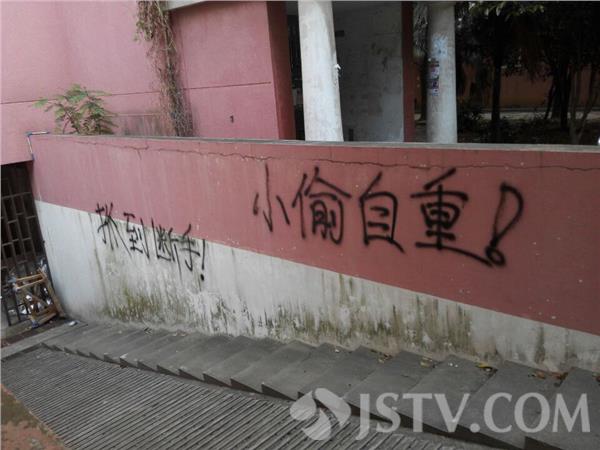 在南京秦淮区梅花山庄一门东过道立柱和地下通道墙上,市民惊奇地发现,小区居民为防小偷,写出了“小偷自重 抓到砍手”等很“雷人”、很“暴力”的警告提示。